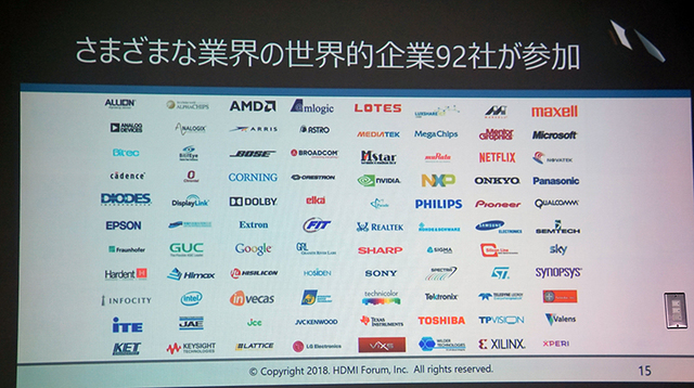 HOME > ニュース > AV&ホームシアターニュース 8K/4K対応、音声やゲーム向け新機能も 対応テレビの準備も完了? 「HDMI 2.1」最新動向をHDMI Licensing CTOに聞く 編集部:風間雄介 2018年03月12日 前の写真へ 次の写真へ HDMI Forumには現在92社が参加している 前の写真へ 次の写真へ この写真の記事へ 関連リンク HDMI 2.1のニュースリリース(PDF、複数言語併記) HDMI Licensing