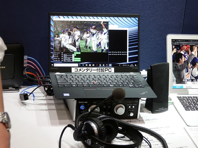 スポーツ中継のネット配信においてPC1台で実況・解説もつけられるようにするシステム。クラウド音声認識技術によってそのまま字幕にすることも可能