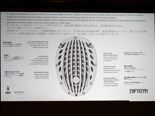 HOME > ニュース > AV&ホームシアターニュース 「天国で一番高いところ」 【ヘッドホン祭】MEZEから世界初、平面駆動でコイルをハイブリッド化したヘッドホン「EMPYREAN」 編集部:風間雄介 2018年04月28日 前の写真へ 次の写真へ 110kHzまで伸びる高域など、優れた特性を実現した 前の写真へ 次の写真へ この写真の記事へ 関連リンク MEZE Audio 春のヘッドホン祭2018 「春のヘッドホン祭2018」関連記事一覧