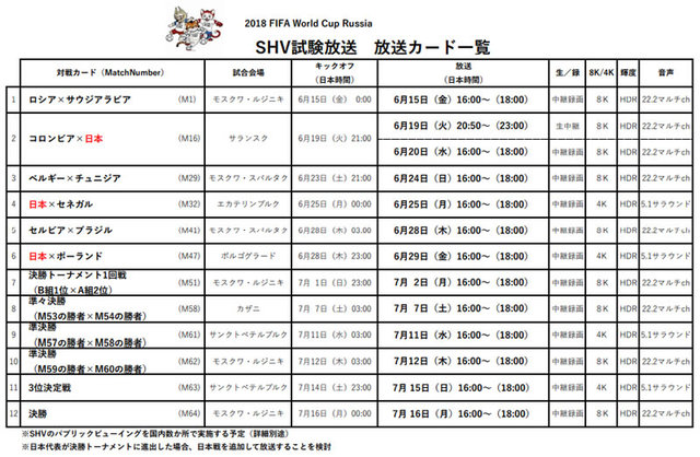 HOME > ニュース > AV&ホームシアターニュース 8K放送はパブリックビューイングを予定 NHK、ロシアW杯で日本戦含む8試合を8K放送。ネットでのマルチアングル動画提供なども 編集部:小野佳希 2018年05月11日 8K/4K試験放送カード一覧 この写真の記事へ 関連リンク 本件の詳細(PDF) NHKワールドカップ特設サイト
