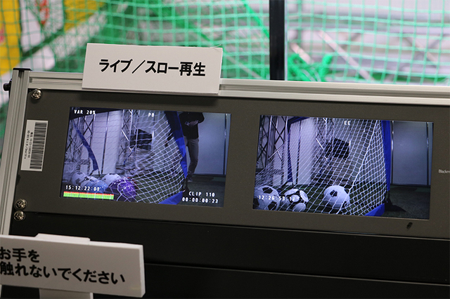 デモ展示ではゴールネットにカメラを配置、8K撮影・記録しながら同時にシュートの瞬間をスロー再生出来る