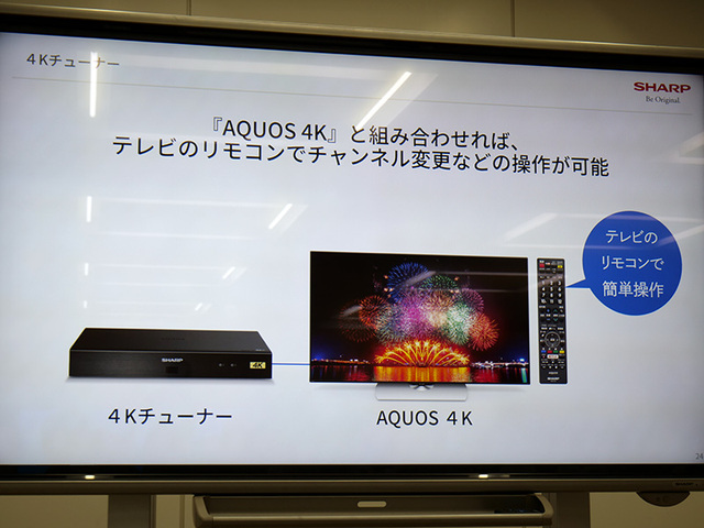HOME > ニュース > AV&ホームシアターニュース 「5万円以下は確実」 シャープ、新4K衛星放送を受信できる「4Kチューナー」を開発発表。11月下旬発売予定 編集部:川田菜月 2018年06月07日 前の写真へ AQUOSと組み合わせれば、テレビのリモコンでチャンネル変更などの操作が可能だ 前の写真へ この写真の記事へ 関連リンク シャープ 液晶テレビ AQUOS