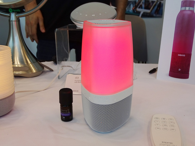 アロマ機能付のワイヤレススピーカー「iZABT50」。背面から精油を入れてアロマディフューザー機能が使える