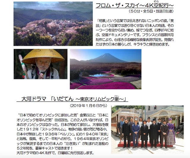 HOME > ニュース > AV&ホームシアターニュース 具体的な番組表は10月下旬公開予定 NHK、12月放送開始「BS4K」「BS8K」の番組編成を発表。世界初の4K南極生中継など 編集部:川田菜月 2018年09月20日 前の写真へ 次の写真へ フランスと国際共同制作のシリーズ番組「フロム・ザ・スカイ〜4K空紀行〜」や大河ドラマなど幅広いジャンルの番組を4Kで放送する 前の写真へ 次の写真へ この写真の記事へ 関連リンク 本件の詳細 4K/8Kの主な番組一覧 BS4Kの番組予定表 BS8Kの番組予定表 NHK