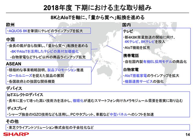 HOME > ニュース > AV&ホームシアターニュース 通期業績も上方修正 シャープ2Qは売上・利益共に好調、下期は8K/AIoTで「量から質」転換を鮮明に 編集部:風間雄介 2018年10月30日 次の写真へ 下期の取り組み。戴正呉会長自ら、中国事業の「量から質へ」の転換を進めるという 次の写真へ この写真の記事へ 関連リンク 2018年度第2四半期と上半期の業績(PDF) シャープ