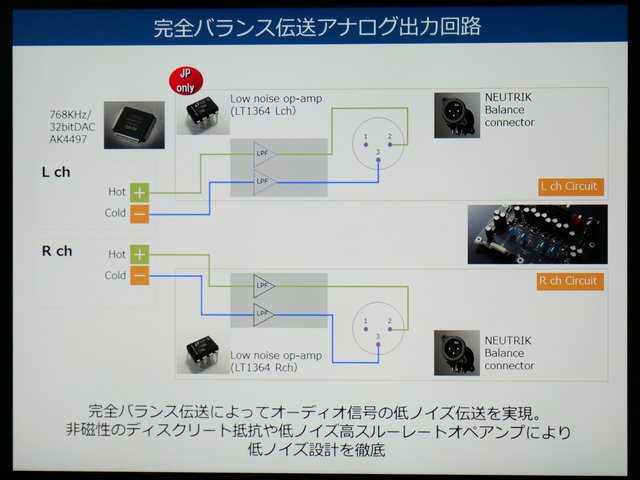 完全バランス伝送による2chのアナログオーディオ出力端子を備える。オペアンプも欧州版から変更した