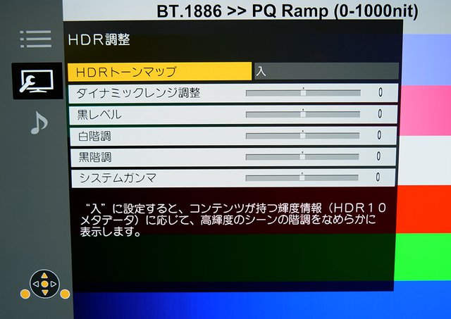 HDRトーンマップやダイナミックレンジ、システムガンマなどの調整画面