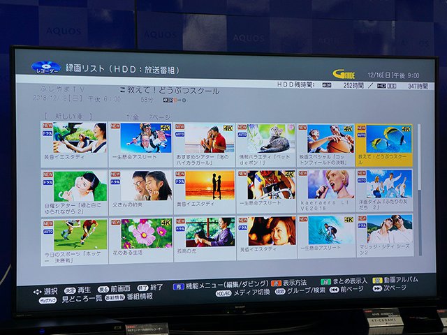 HOME > ニュース > AV&ホームシアターニュース メディア向け説明会を開催 「AQUOS 4Kレコーダー」、新4K衛星放送を “録る” だけでなく “見る” にも便利。詳細を聞いた 編集部:小野佳希 2018年11月21日 前の写真へ 録画番組リスト。4K番組には4Kアイコンが表示される 前の写真へ この写真の記事へ 関連リンク シャープ AQUOS 4Kレコーダー 公式情報 シャープ