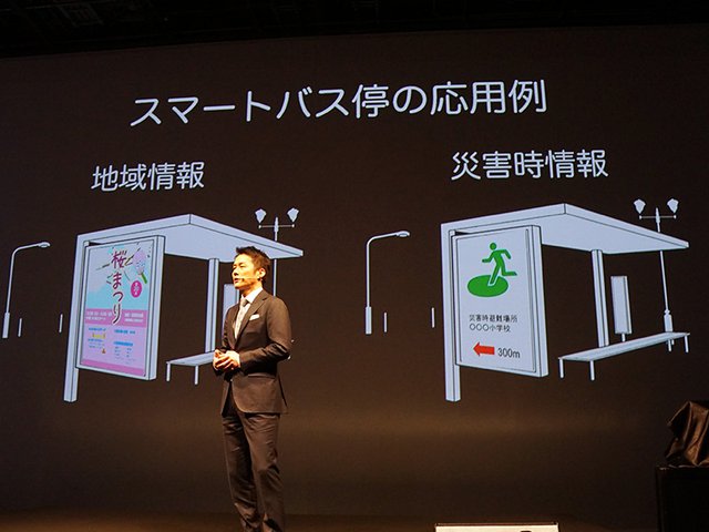 行き先の強調表示や多言語対応だけでなく地域情報や災害時情報の表示などサステナブルな街づくりにもスマートバス停は貢献すると紹介