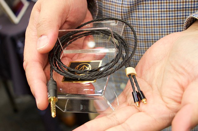 オーディオテクニカのA2DC端子対応ケーブルを展示。ほとんどの製品ラインナップに対応するとのこと