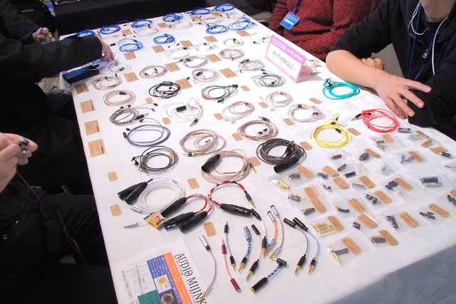 オーディオみじんこは様々なオリジナルリケーブルの展示/販売を実施。NOBUNAGA Labsの銀メッキプラグを用いた試作機も参考展示