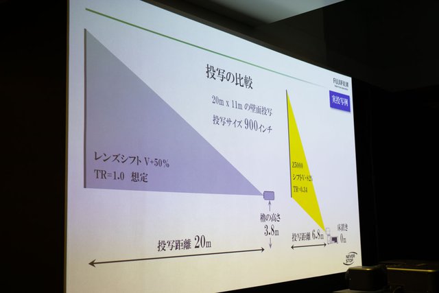 従来のプロジェクターでは、900インチを投映する場合には、高い位置かつ20mの距離が必要だった