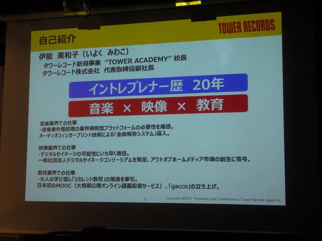 HOME > ニュース > AV&ホームシアターニュース 人材輩出で新市場を創造する タワレコの新規事業「TOWER ACADEMY」発表会詳細。5G化の加速で生み出すエンターテインメントとは Senka21編集部 徳田ゆかり 2019年02月18日 次の写真へ 「音楽×映像×教育」のイントレプレナーとして活躍した伊能氏 次の写真へ この写真の記事へ 関連リンク タワーレコード、5G時代の音楽エンタメ人材を育成する「TOWER ACADEMY」開校 「TOWER ACADEMY」webサイト タワーレコード