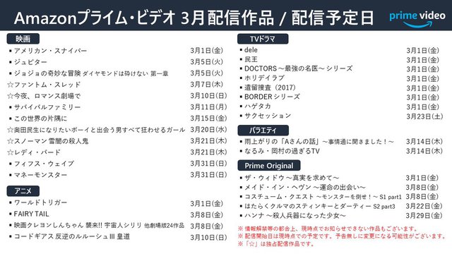HOME > ニュース > AV&ホームシアターニュース 『遺留捜査(2017)』などTVドラマも充実 Amazon Prime Videoで実写『ジョジョ』や劇場版『クレしん』24作品など見放題に。3月の配信タイトル発表 編集部:押野 由宇 2019年02月21日 この写真の記事へ 関連リンク Amazon Prime Video