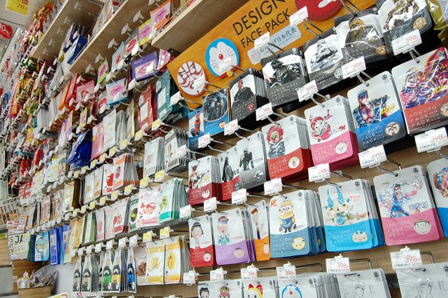 人気上昇中の美顔パックは和柄やキャラクターものなど多様化するラインナップを数多く取り揃える。階段の壁面を使って展示