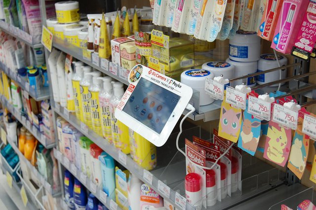 売り場の随所に設置されるPaykeタブレット。日本語、英語、簡体語、繁体語、韓国語、タイ語、ベトナム語の7言語に対応する