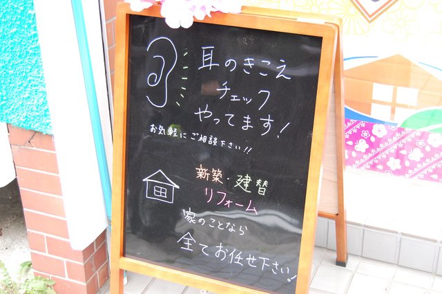 通りからも目に入るサインボードには「耳のきこえチェック」と「新築・建て替え・リフォーム」を訴求