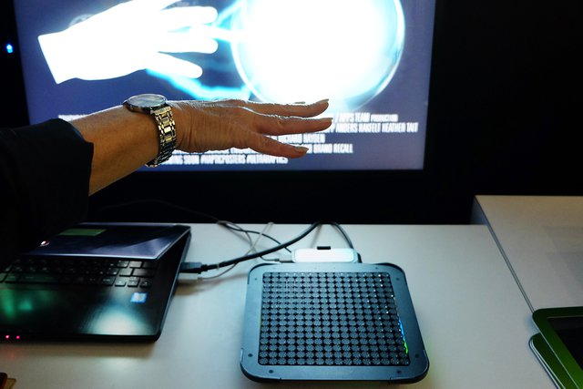 空中ハプティクス技術のデモの様子。手が装置からある程度離れていてもしっかり動作する