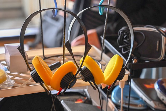 自作のコンデンサータイプヘッドホンも多数展示
