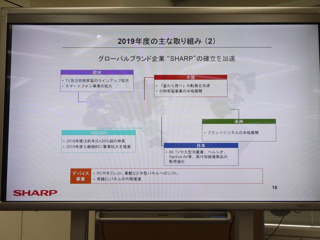 HOME > ニュース > AV&ホームシアターニュース 収益力の強化推進 シャープが'18年度連結業績を発表。「量から質」への転換で業績予想から下振れも最終黒字を確保 Senka21編集部 徳田ゆかり 2019年05月09日 前の写真へ グローバルブランド企業の確立も加速 前の写真へ この写真の記事へ 関連リンク シャープ(株) 2019年3月期 決算資料