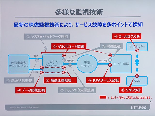 HOME > ニュース > AV&ホームシアターニュース dTVやDAZNなど他社サービスもサポート NTTぷららが「メディアオペレーションセンター」拡充。高品質映像配信を支える拠点を見てきた 編集部:小野佳希 2019年05月24日 前の写真へ 最新技術を用いて様々なポイントで監視してトラブルを検知 前の写真へ この写真の記事へ 関連リンク NTTぷららメディアオペレーションセンター拡充の詳細 NTTぷらら