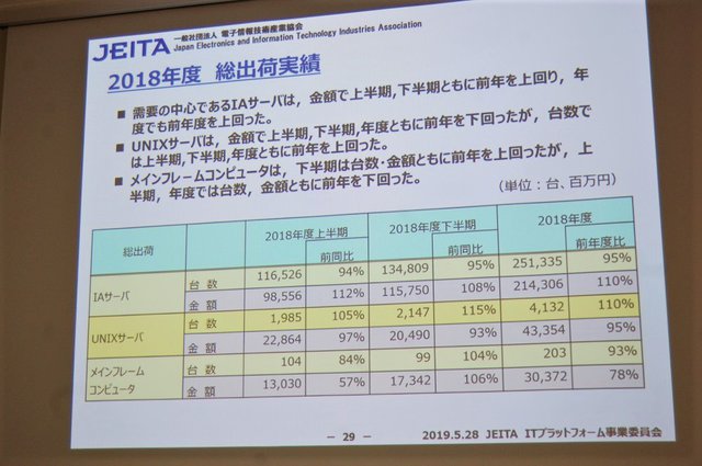 UNIXサーバは対前年度比で台数ベース増・金額ベース減。メインフレームコンピューターは同台数ベース減・金額ベース減で推移する