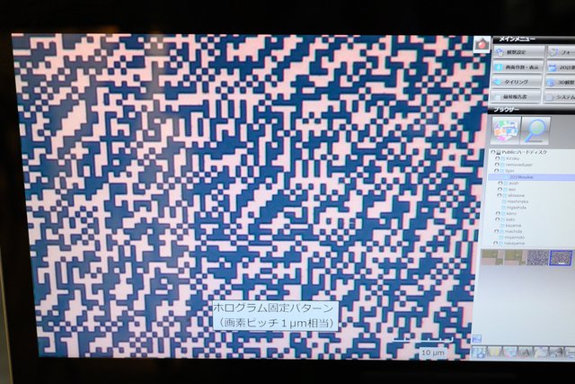 ホログラフィーを拡大すると、このようなパターンで印刷されている。このパターンを電気的に切り替えることを目指す
