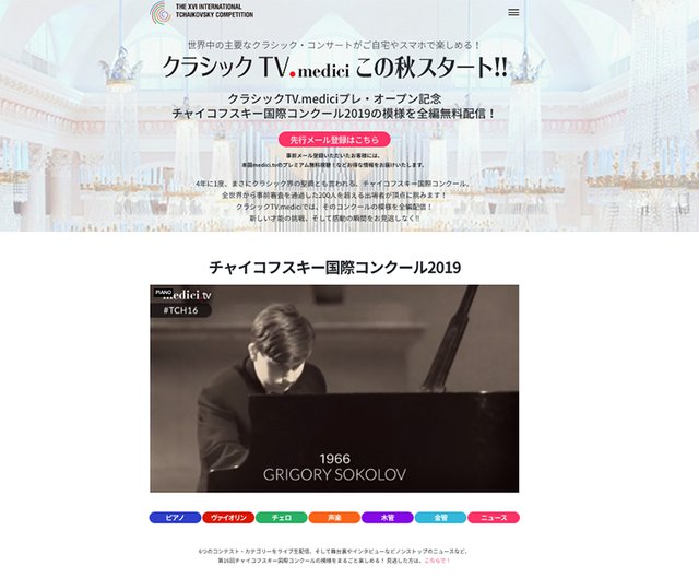 HOME > ニュース > AV&ホームシアターニュース 「クラシックTV.medici」にて 日本初「チャイコフスキー国際コンクール2019」が全編無料配信。6月18日から 編集部:小澤麻実 2019年06月11日 「クラシックTV.medici」にて全編無料配信 この写真の記事へ 関連リンク クラシックTV.medici