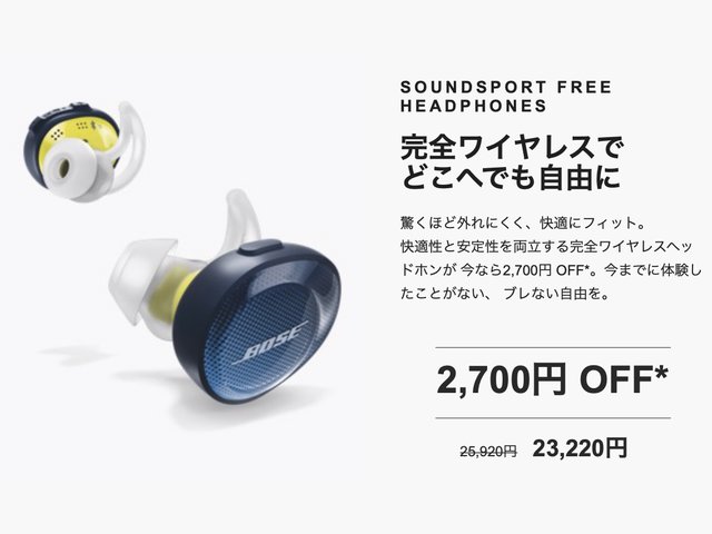 HOME > ニュース > AV&ホームシアターニュース 期間限定8月13日(火)まで ボーズ、最大5940円OFFの夏休みセール。完全ワイヤレスやBluetoothスピーカーがお得に 編集部:平山洸太 2019年07月22日 前の写真へ 「SoundSport Free wireless headphones」 前の写真へ この写真の記事へ 関連リンク 「SoundSport Free wireless headphones」 「SoundLink Revolve+ Bluetooth speaker」 ボーズ