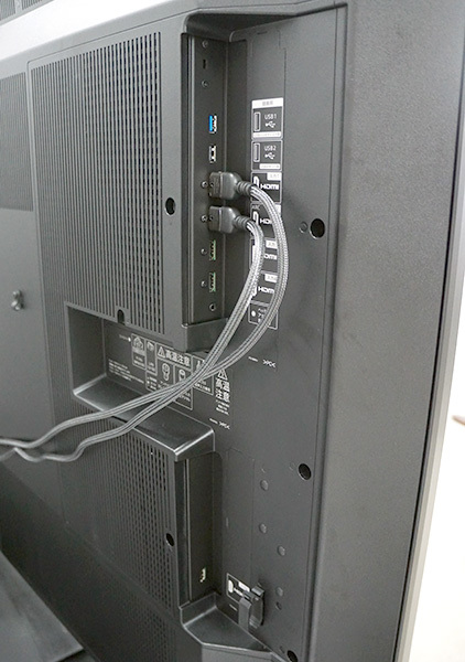 背面端子部。最上部2つがUSBで、その下にHDMIを4系統装備。機体最下部に離れてHDMIをもう1系統備えている
