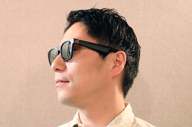 装着した様子。通常のサングラスとほぼ変わらない外観。質量も45gと軽量なのも快適な装着感につながっている