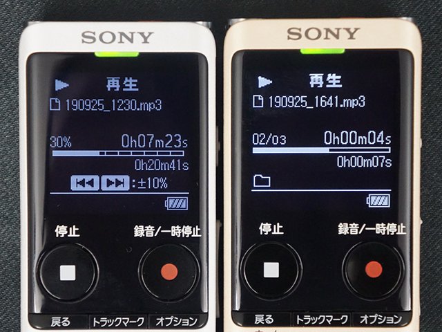HOME > ニュース > AV&ホームシアターニュース 画面大型化などで使い勝手も改善 ソニー、足音など背景ノイズを高精度抑制して録音できる薄型ICレコーダー「UX570Fシリーズ」 編集部:小野佳希 2019年10月08日 前の写真へ 「タイムジャンプ」機能オンオフの比較。オン時(左)はファイルの時間表示バーが10分割される 前の写真へ この写真の記事へ 関連リンク ソニー ICレコーダー ソニー