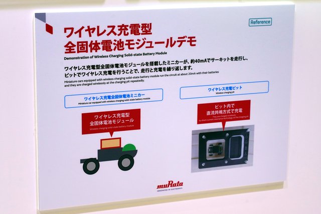 会場では全固体電池用のワイヤレス充電モジュールも展示され、ミニカーに載せて充電しながら走らせるデモが行われた