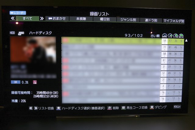 実際の録画リスト画面。タイトルの右側には各モードごとの再生時間、および再生できない場合は×マークが表示される