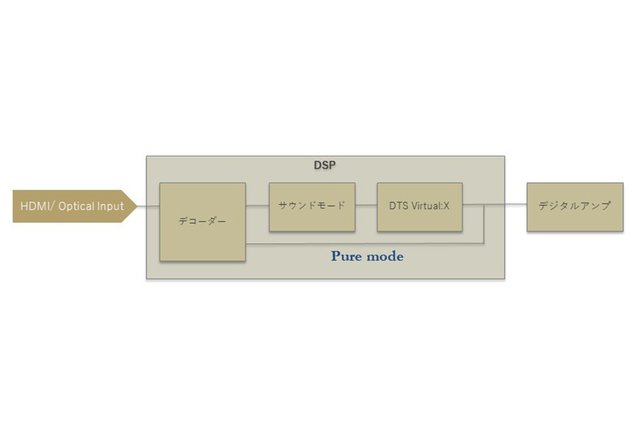 「Pureモード」における信号経路を表した図。デコード後の音声処理をバイパスし、可能な限りオリジナルに近い信号をアンプへ届ける