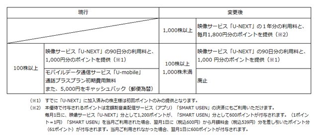 HOME > ニュース > AV&ホームシアターニュース 1,000株以上保有の株主が対象 USEN-NEXT HD、株主優待を拡充。「無料で使えるU-NEXTアカウントと毎月1,800円分のポイント提供」プラン追加 編集部:杉山康介 2019年11月21日 株主優待プランの変更図 この写真の記事へ 関連リンク 本件のニュースリリース USEN-NEXT HOLDINGS