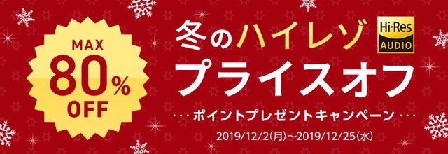 HOME > ニュース > AV&ホームシアターニュース 1万円以上購入で1,500ポイントが貰えるキャンペーンも mora、最大80%OFFの「冬のハイレゾプライスオフキャンペーン」。約1,000作品が安く 編集部:平山洸太 2019年12月02日 この写真の記事へ 関連リンク 特設ページはこちらから mora