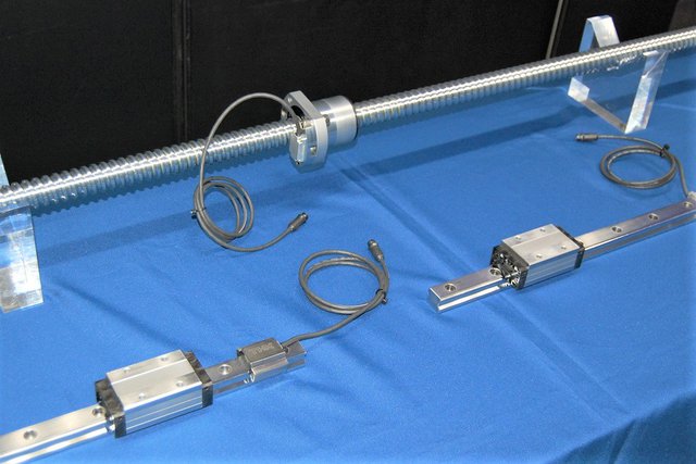 振動センサーは、既存設備のLMガイド(写真下方)へ後付けが可能。さまざまなアタッチメントで上面、端面などフレキシブルな取り付けられる。第二弾として、LMガイドとセットで使用されることが多い「ボールねじ」(写真上方)への対応を予定