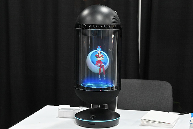2次元キャラクターを立体的に表示できるデバイス「Gatebox」も出展。海外では実在の人物をモデルにしたキャラクターを表示させ、ジムのインストラクターや施設の館内ガイドとして普及させたいとのこと