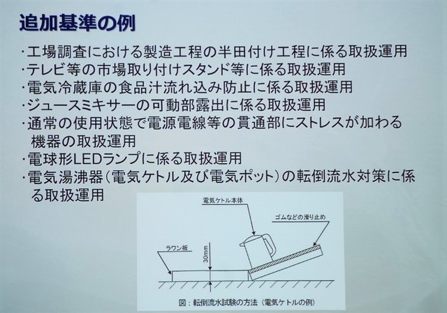 HOME > ニュース > AV&ホームシアターニュース 電気製品認証協議会が製品安全セミナーを開催 安心・安全な暮らしに知っておきたい電気製品の安全性。「Sマーク」取得による4つのメリットとは PHILE WEB ビジネス編集部・竹内純 2020年01月27日 前の写真へ 次の写真へ 追加基準の例。近年では急速に普及した電気ケトルの転倒によるこどものやけどが多発。取扱運用で早期の対応が図られた 前の写真へ 次の写真へ この写真の記事へ 関連リンク 電気製品認証協議会(SCEA) 一般財団法人 電気安全環境研究所(JET)