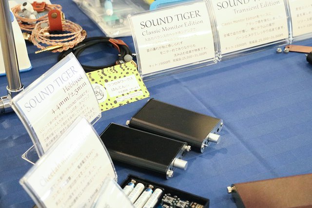 タッグでの出展となるはんてん&じんそんブース。はんてん氏はポタアン「SOUND TIGER」を始めとした製品(写真左)を、じんそん氏はラズパイに液晶や真空管アンプを載せたDAP(右)を展示していた