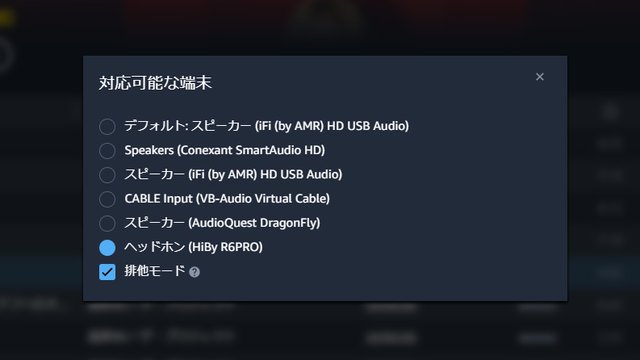 HOME > ニュース > AV&ホームシアターニュース アプリバージョン7.11.0.2182で利用可能 Windows版「Amazon Music HD」アプリに、音声出力切り替え/排他モード機能が追加 編集部:成藤 正宣 2020年03月06日 前の写真へ 複数のオーディオ機器が接続されている場合もアプリ上から使用する機器を選択できる 前の写真へ この写真の記事へ 関連リンク デスクトップ版「Amazon Music」アプリ製品ページ Amazon Music HD Amazon Music Unlimited