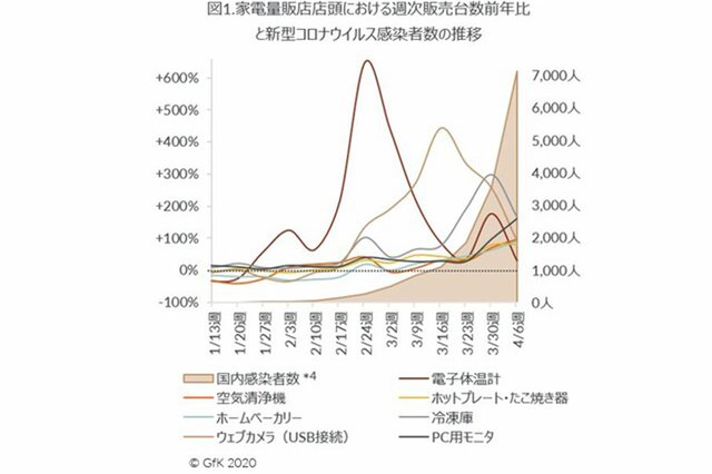 HOME > ニュース > AV&ホームシアターニュース 調理家電やテレワーク関連製品など増加傾向 家電・IT製品の販売、新型コロナ影響で店頭は前年比13%減、ネットは18%増。GfKが動向発表 編集部:川田菜月 2020年04月22日 店頭の週次販売台数と新型コロナウイルス感染者数の推移 この写真の記事へ 関連リンク 本件のニュースリリース
