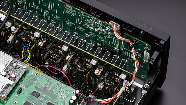 7ch分のパワーアンプ回路は全ch同一構成。パーツ配置や回路を最適化してノイズの影響を受けにくくしている