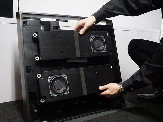 スタンド内部。大容量バスレフ型重低音バズーカを2基搭載