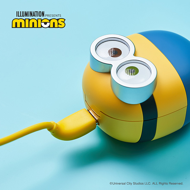 充電ケース、イヤホン本体、USBケーブルに至るまでミニオンズをモチーフにデザイン