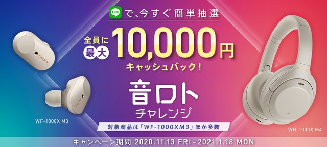 HOME > ニュース > AV&ホームシアターニュース 11/13から2021年の1/18まで ソニー、イヤホンやウォークマンなど購入で最大1万円キャッシュバックキャンペーン 編集部:杉山康介 2020年11月10日 次の写真へ 「年末音ロトキャンペーン」 次の写真へ この写真の記事へ 関連リンク 「年末音ロトキャンペーン」特設ページ 「WALKMANキャッシュバックキャンペーン」特設ページ ソニー
