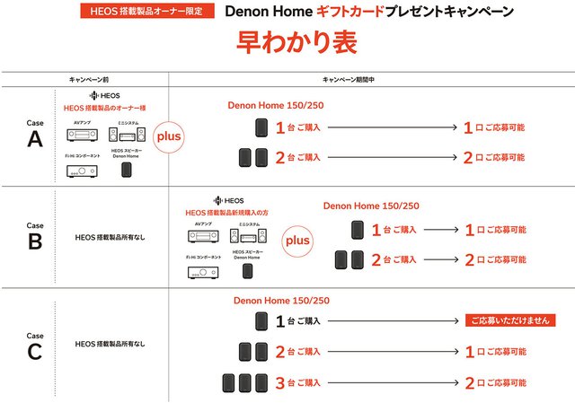 HOME > ニュース > AV&ホームシアターニュース 5,000円または3,000円分が当たる デノン、「DENON HOME」購入でVプリカギフトコードプレゼント。「HEOS」製品ユーザーが対象 編集部:成藤 正宣 2020年11月16日 前の写真へ DENON HOMEとHEOS製品の同時購入も対象となる。詳しい組み合わせ例はキャンペーン公式サイトで解説されている 前の写真へ この写真の記事へ 関連リンク キャンペーン特設ページ DENON HOME デノン