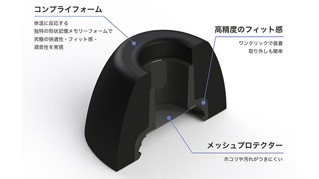 ブランド独自の低反発素材により、体温でより柔らかくなって耳へのフィット感が向上する