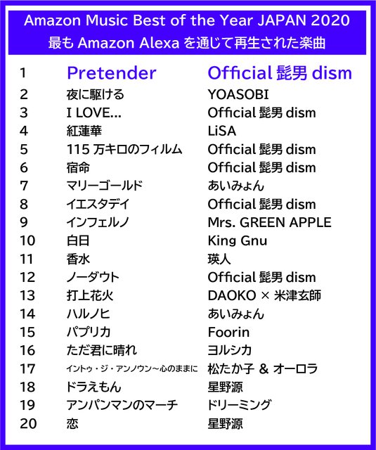 Amazon Music、2020年はOfficial髭男dismが3冠。上位には米津玄師やLiSAなども